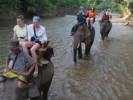 | After having breakfast and shopping some souveniers from the Lisu we resumed our jungle walk. Target for today was the village of the hilltribe "Karain". One highlight of the 4-hour jungle walk was the crossing of the river. Afte having meal we took our chances in riding elefants. I did not feel very well on the elefant because you sit really high and if the elefant does a step foreward you often have to hold on thight. We arrived the village of the Karain at 4:30 pm. After getting to know the family where we could spend a night we had the choice getting a bucket shower or taking a bath in the river. I think the second choice became the primary coice of our group. We had an excellent dinner, fun and then....all girls went to bed, michael and myself joined Pong and some local people singing songs and having some Thai Whiskey <<explain>> Again this village had only very limited access to electricity. | ![]() ![]() ![]() ![]() ![]() ![]() |